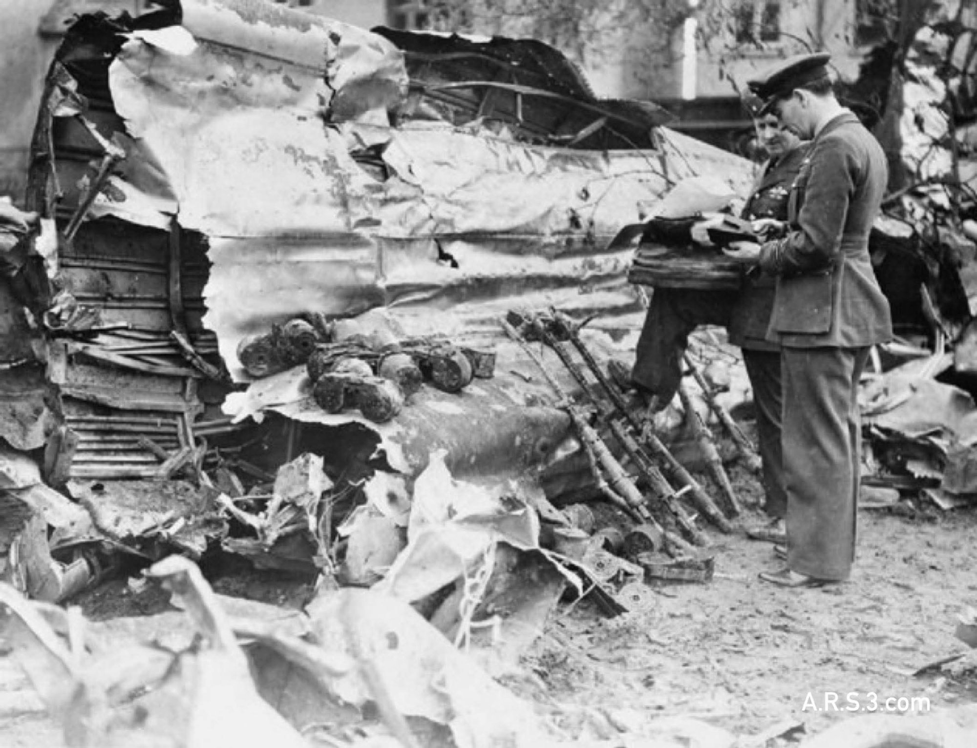 Armament: The aircraft was carrying at least two types of smaller magnetic mine, one of which exploded four minutes after the aircraft crashed, scattering wreckage over a wide area and setting fire to it. Armament: five machine guns were found in the wreckage and evidence of armour plate, one piece of which was shaped to the pilot’s back.