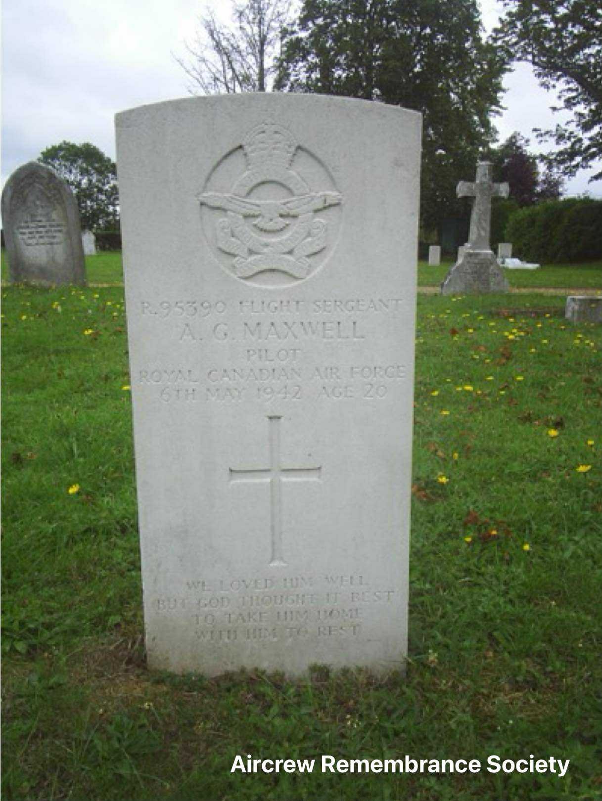 F/Sgt Arnold Grant Maxwell Kempston Cemetery, Kempston, Bedfordshire. Block J, Graves 77 Son of Thomas Edward and Mary Irene Maxwell, of Portage la Prairie, Manitoba, Canada.