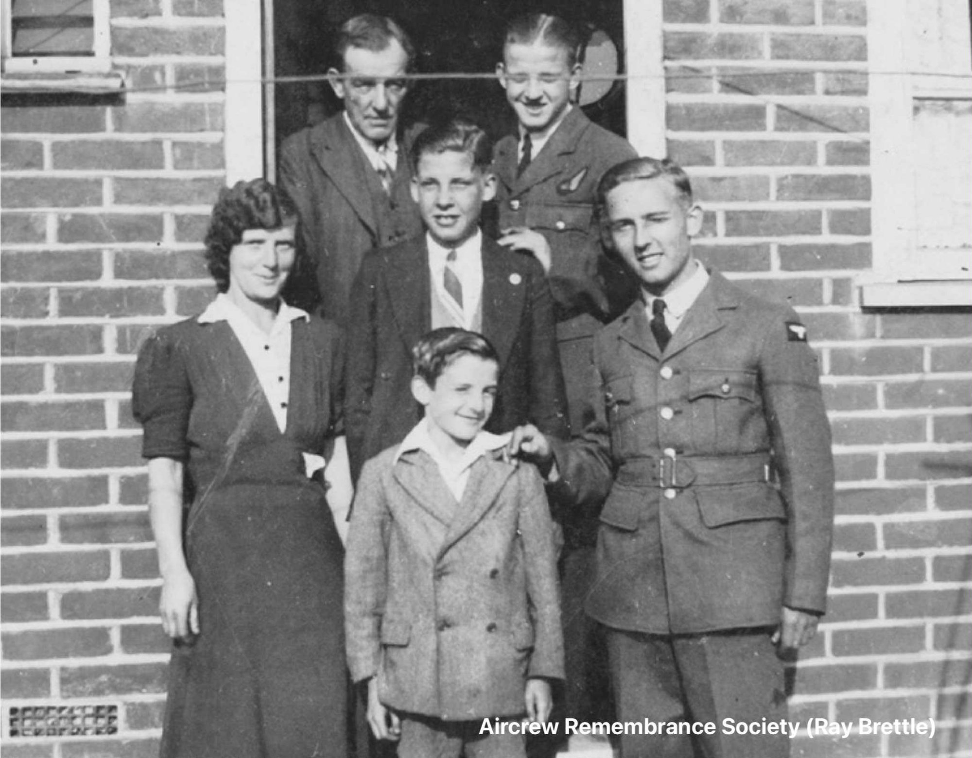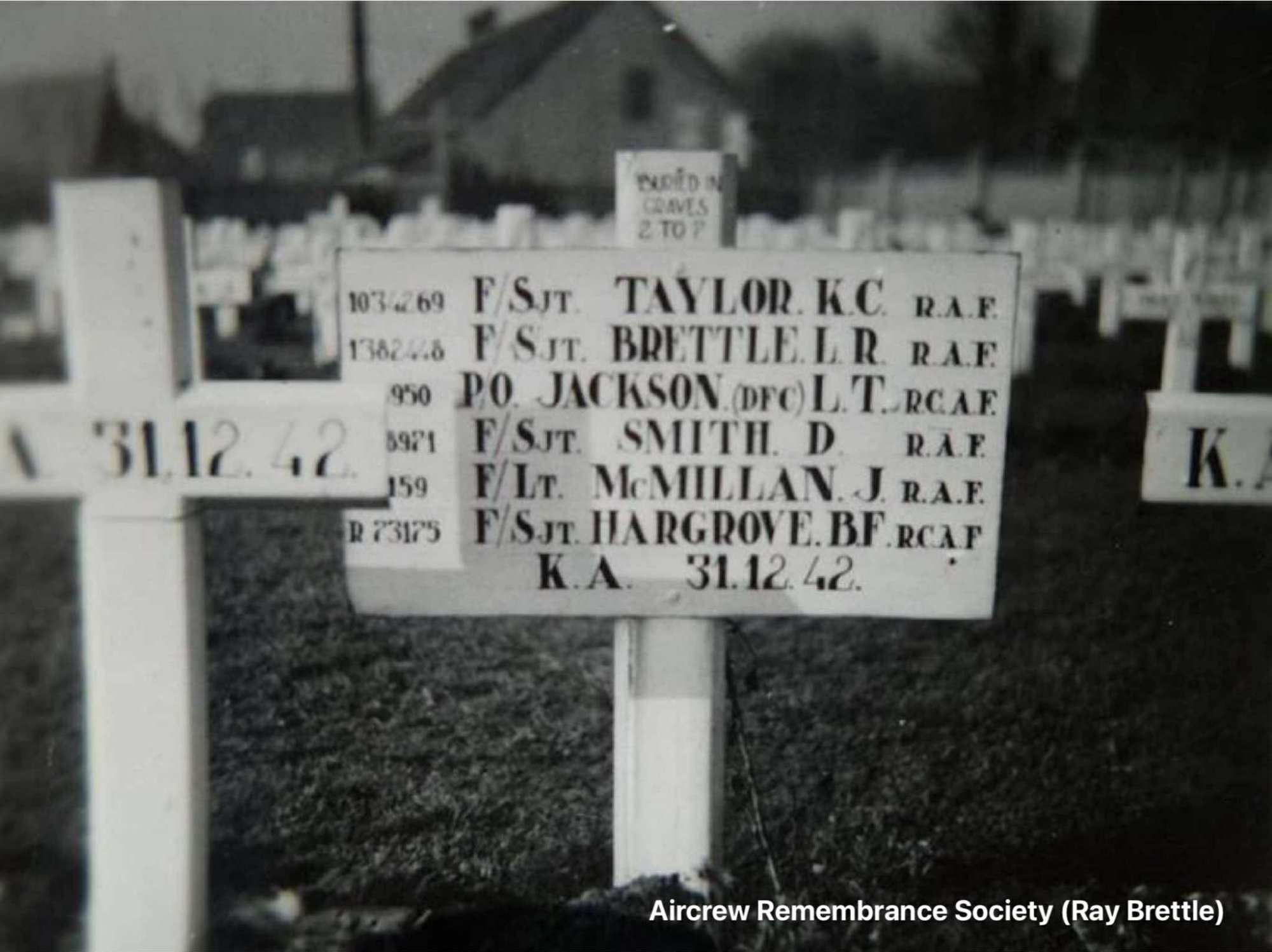 Pilot officer L.T. Jackson R.C.A.F, Fl/Sgt D. Smith, Fl/Lt J. McMillan, Fl/Sgt. K.C Taylor, Fl/Sgt B.E. Hargrove R.C.A.F, Fl/Sgt. D.Crossthwaite, R.C.A.F, Fl/Sgt L.R. Brettle."