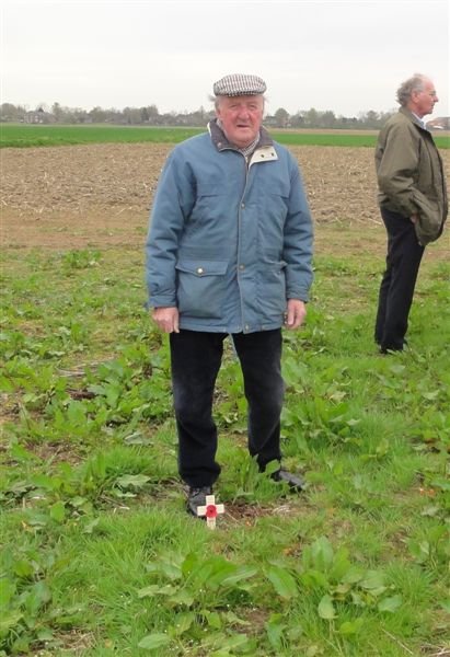 "Everybody was so incredibly sincere in their gratitude and it made us feel proud and not least - very humble indeed. Hans later took us to the crash site of the Lancaster-which he had found after much local research and we stood silently for a short while with our own private thoughts for Les and indeed the entire crew. Len took a moment to place a small wooden cross with a poppy on it in the field. We were also joined by Joost Vlemix - who is a local archaeologist and he had actually scoured the field with metal detectors and even after all these years had found many items of wreckage believed to have come from the crashed Lancaster. It is yet to be confirmed that are from the actual aircraft as by a one in a million chance it turns out that a Gloster Meteor had also crashed in that very same field sometime in the 1950`s! We then went invited to visit a local farmhouse where yet again we were invited in for coffee and home-made cakes. The lady in this house and her son Hans Markx once again were so incredibly welcoming and it transpired that as a young girl she had witnessed the crash. She also sadly told the tale of many other crashes in the local area by British/American and German aircraft."