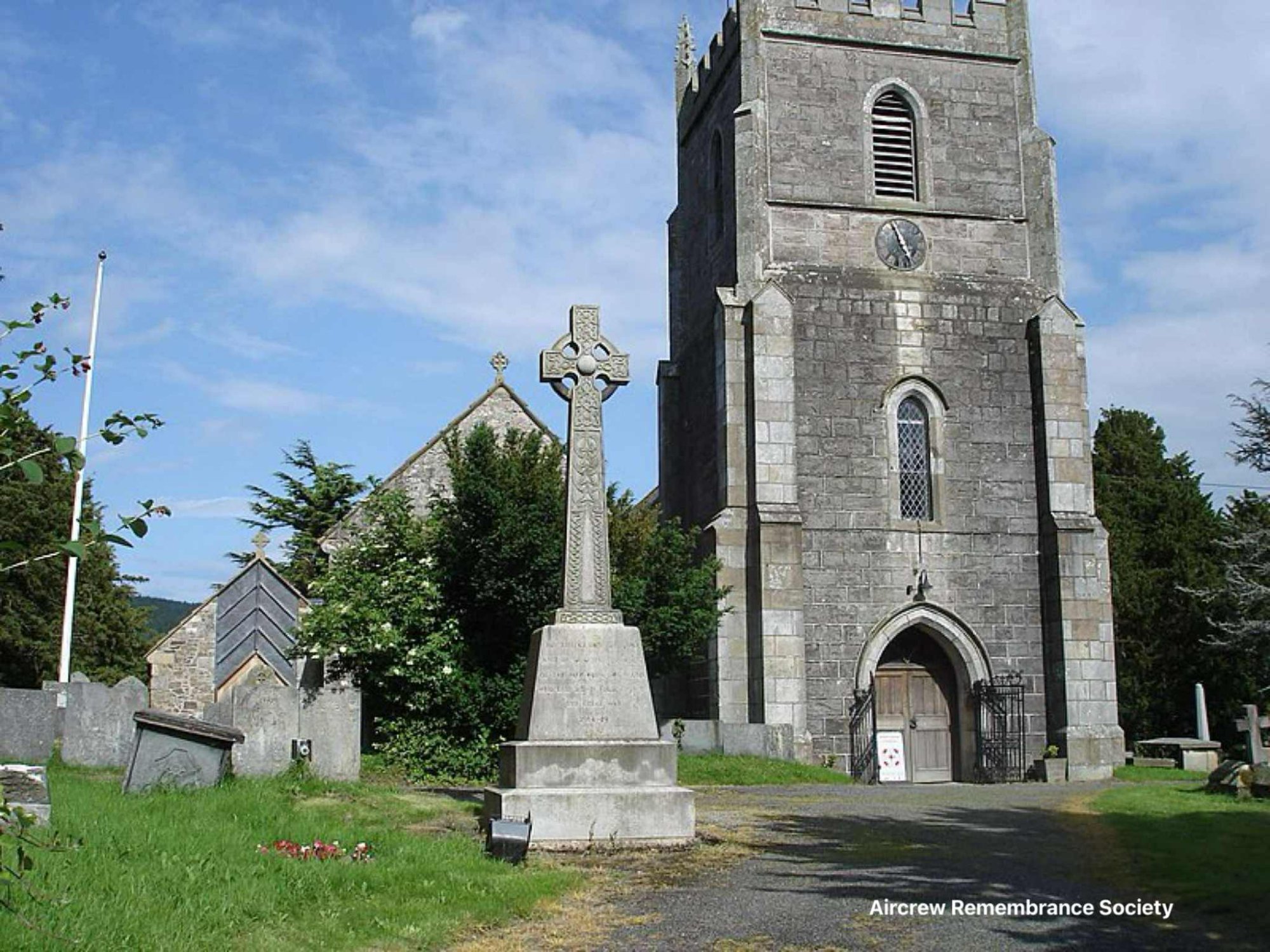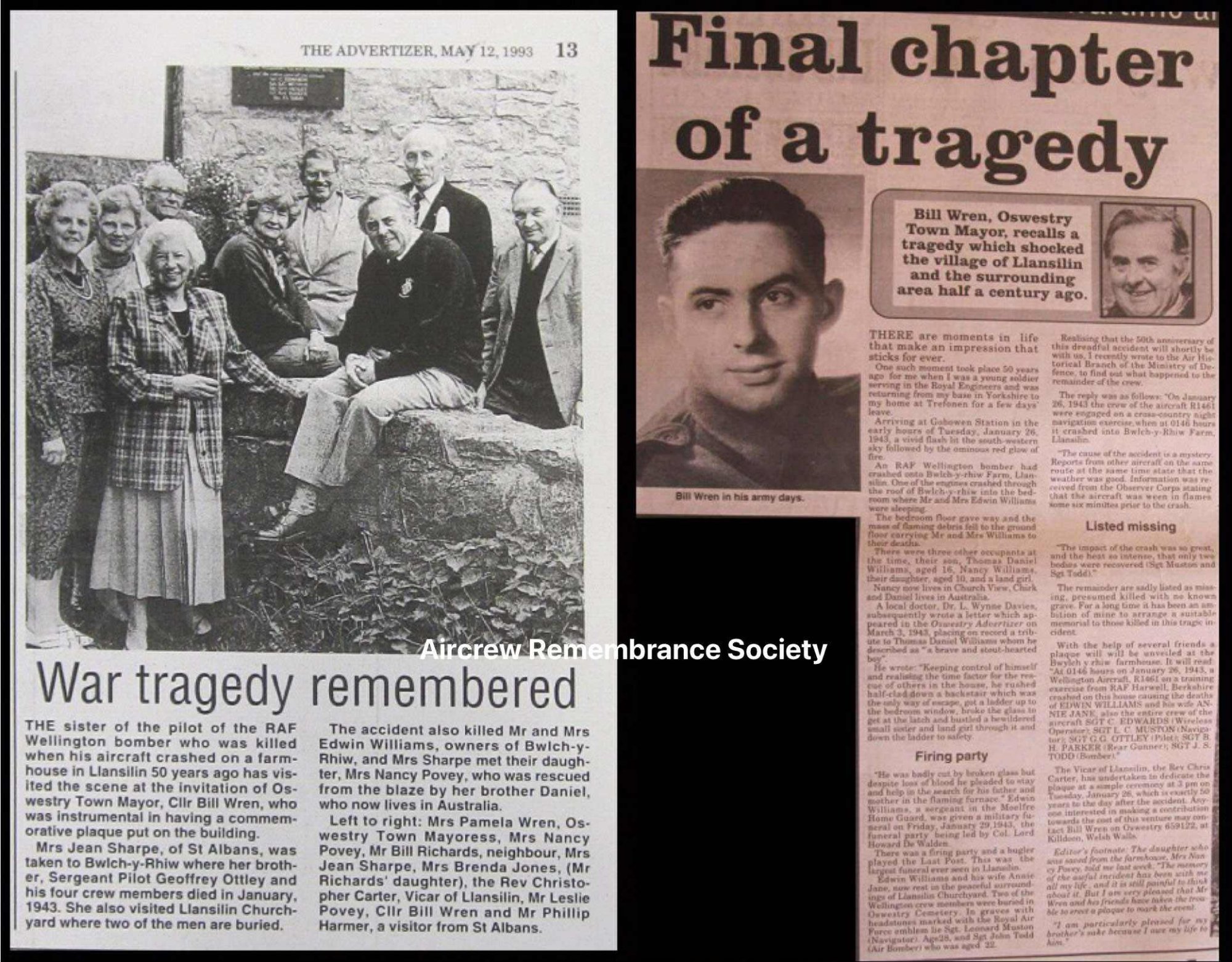 At 0146 hrs the Wellington crashed into the side of Bwlch Y Rhiw farmhouse, on the B4580 Oswestry road two miles from the village of Llansilin, Shropshire (precise location is 52° 18’ N 3°59’ W). All five crew died. The occupants of the house, Edwin Williams and his wife Annie Jane were also killed, but their son Dan and daughter Nancy survived, as did a Land Girl who was staying at the house. Nancy and the Land Girl were trapped by the fire which followed the collision; they were very bravely rescued by Dan who suffered serious injuries during the rescue.
