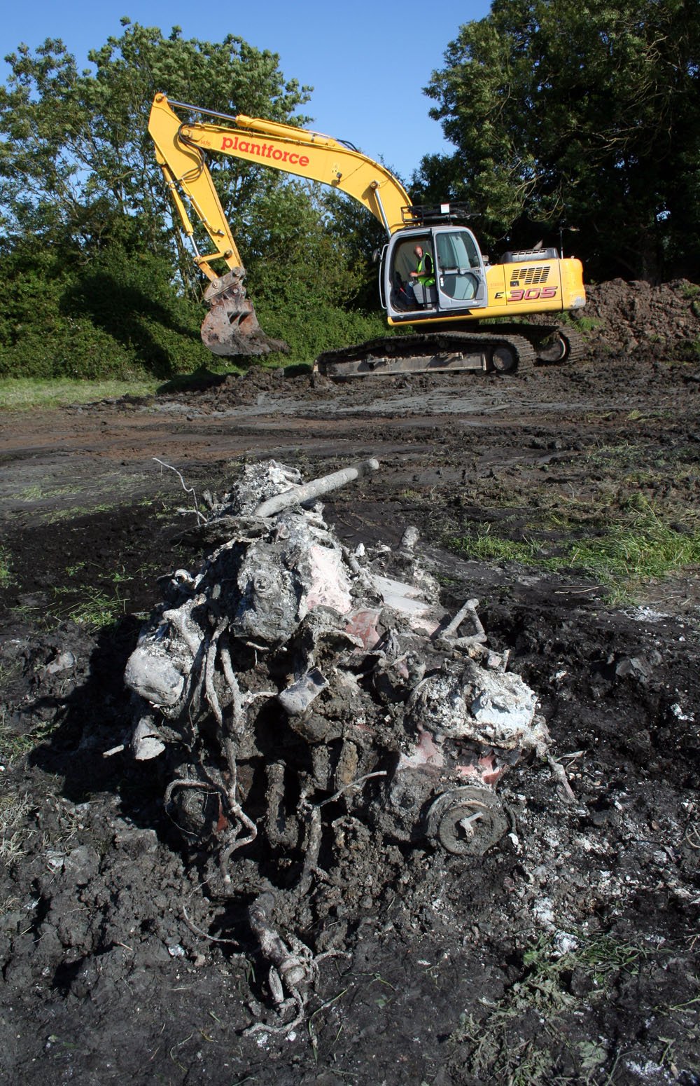 A previous dig by the landowner in the 1970s recovered one engine, but a magnetometer survey indicated that the second engine and substantial wreckage was deeply buried. A very large excavator was needed to reach the engine, which was buried in soft clay.