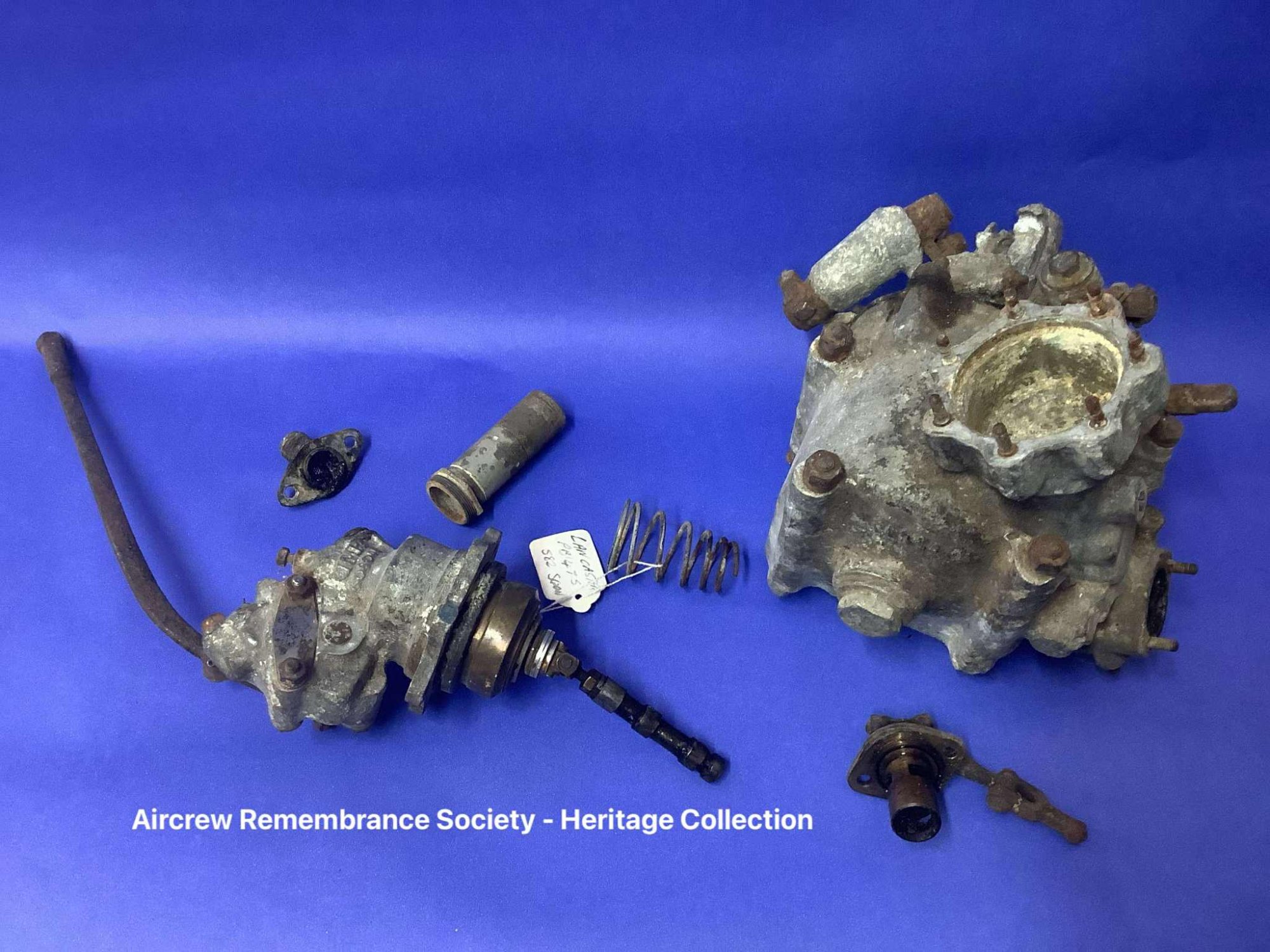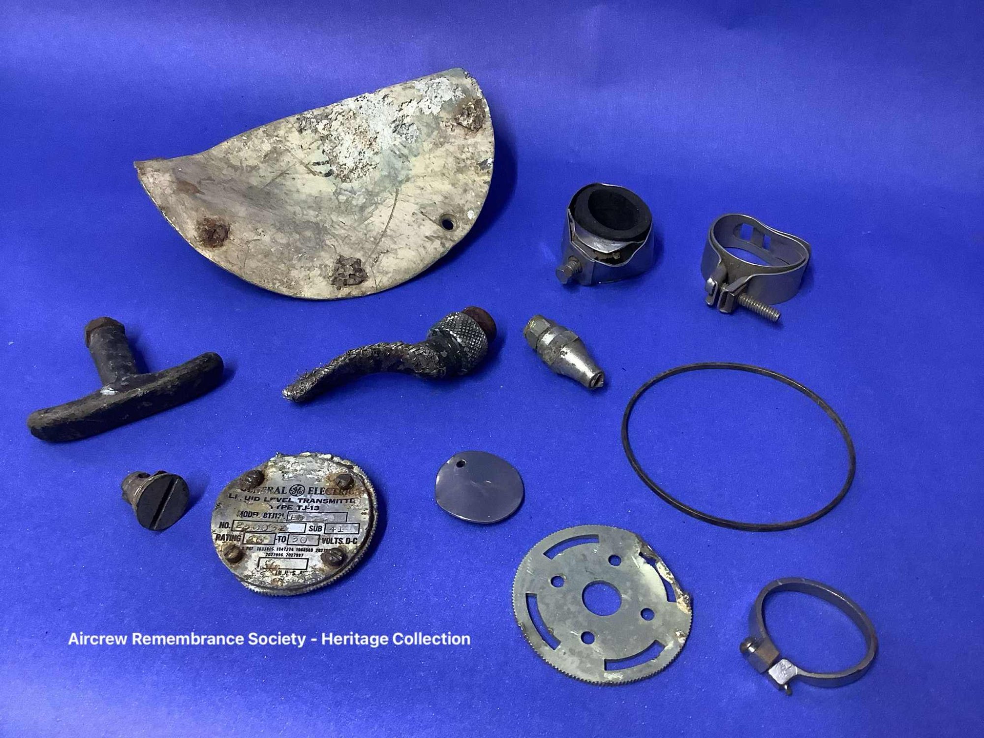 Collection of aircraft parts from Wellington HE727, which include fuel & hydraulic parts.