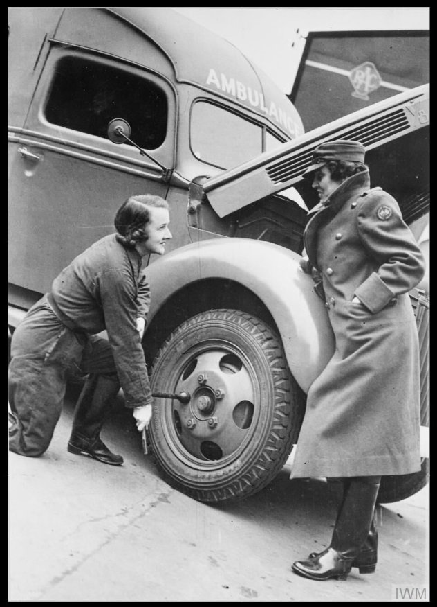 Miss Winifred Ashford (right) looks on as Mrs Pat Macleod tightens a nut on the wheel of her ambulance. The bonnet of the ambulance is open, ready for an inspection of the engine to be carried out. This photograph was probably taken at the depot in Paddington in 1940. Image: IWM (D 2546)