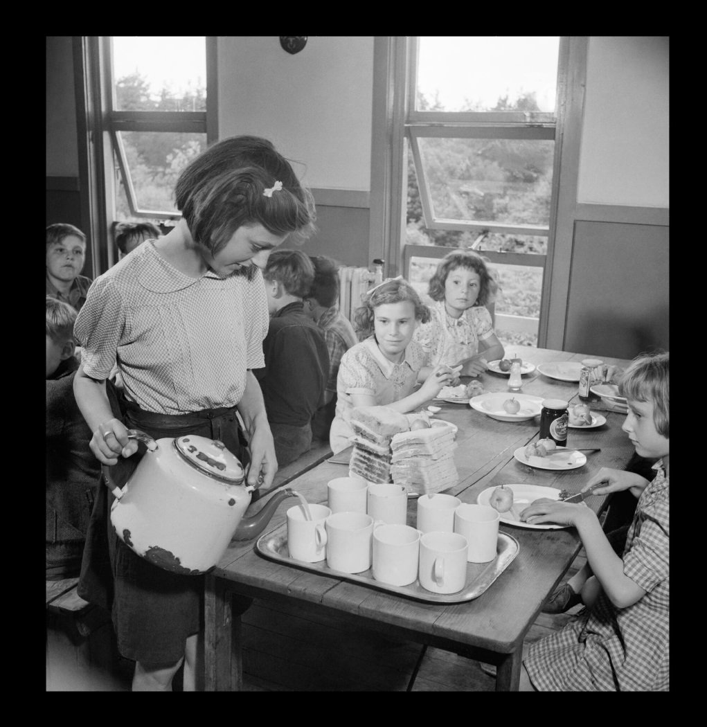 June Beale pours tea for her friends in the dining hall at Marchant's Hill camp school for evacuees, Hindhead, Surrey, UK 1944. June is the table monitor of the group. According to the original caption, her father is a Chief Petty Officer in the Royal Navy. The children are about to tuck in to bread and jam and an apple. IWM (D 21623)