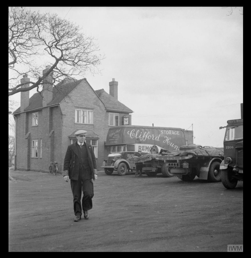 Lorry driver Fred Horrod walks back towards his vehicle after a spot of lunch at a roadside cafe somewhere between Manchester and London. A removal van can be seen parked behind him: 'Clifford Hunt Removal Specialist' is based in Market Street, Crewe. This clearly a popular spot for lorry drivers, as several other vehicles can also be seen on the parking ground. IWM (D 19040)