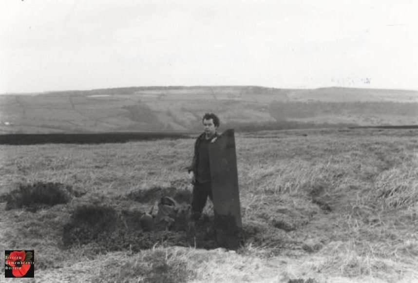 (Right) John Ownsworth on Broomhead Moor in 1981, with the remains of Wellington DV810, that crashed on 9-12-42 (All seven crew survived)