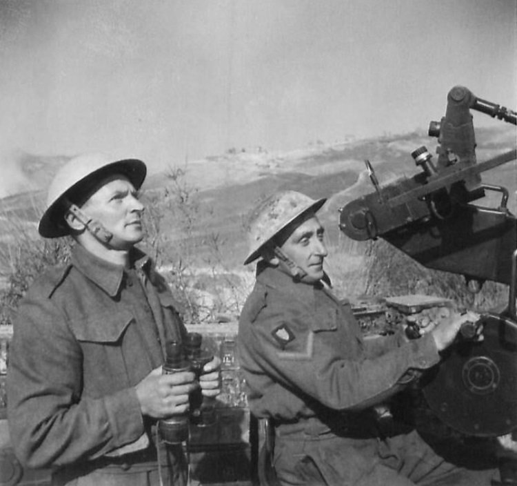 L/Bdr. Dick Tyler, BEM (right) of 131 Oakington Manor Drive, Wembley, Middx has been in the Army for 4 1/2 years, and abroad for 3 3/4 years. Has served in Palestine, Egypt, North Africa, Sicily and Italy, where he landed with the initial assault force. 31 years of age, he is married with a son. He was a milkman in peacetime. Spotting for him is Gnr. Sid Hayward of 39 Grimstone Road, Wolverhampton. 39 years of age, he is married with a family of two girls and a boy. He has served in Egypt, Palestine, North Africa and Sicily. He landed on "D" Day. Photo taken by Sergeant Baynes on the 25th March 1945 at location S. Clemente – Ripiano area Italy.  IWM (NA 23175)